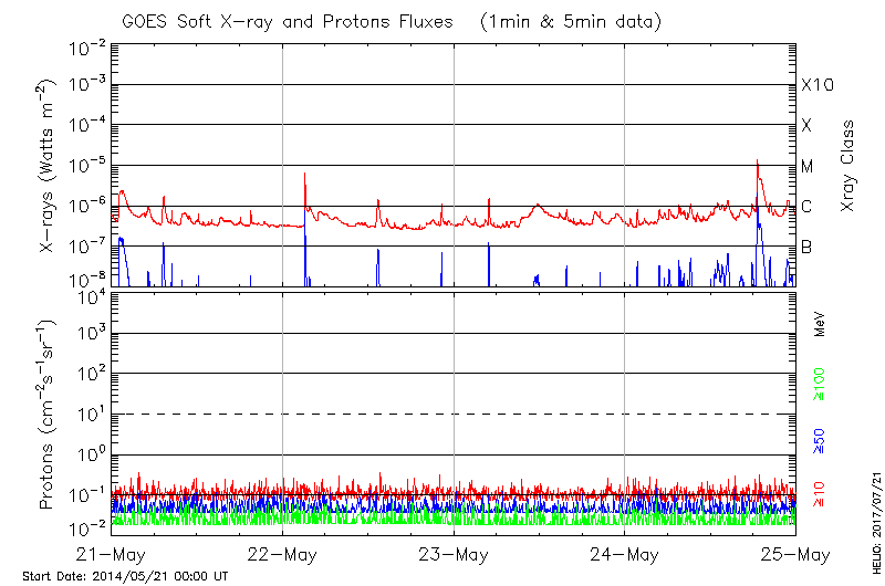 This page provides light-curves generated from GOES soft X-ray and Particle data for the date indicated at the top and the preceding three days.