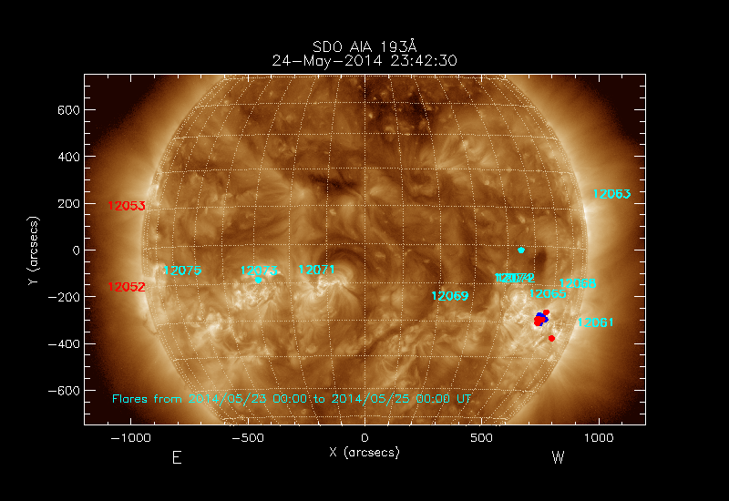 The most recent flares (≤12 hours) are shown as red dots, 12-24 hours ago as blue dots and older ones as turquoise dots.