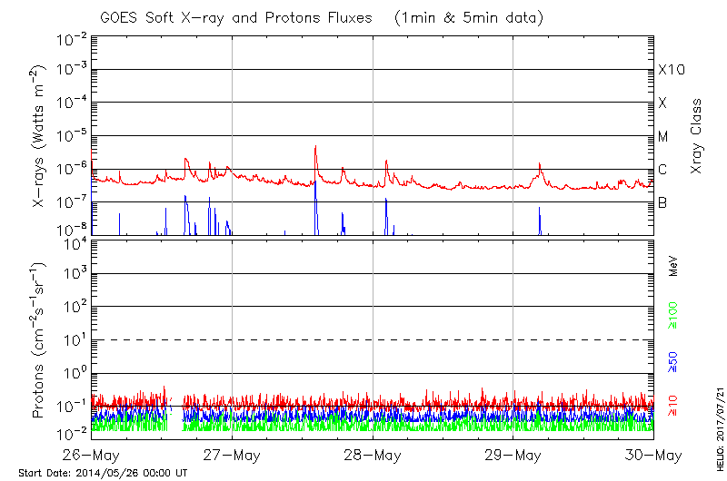 This page provides light-curves generated from GOES soft X-ray and Particle data for the date indicated at the top and the preceding three days.
