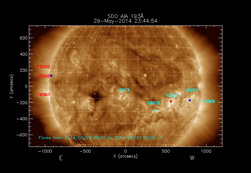 The most recent flares (≤12 hours) are shown as red dots, 12-24 hours ago as blue dots and older ones as turquoise dots.