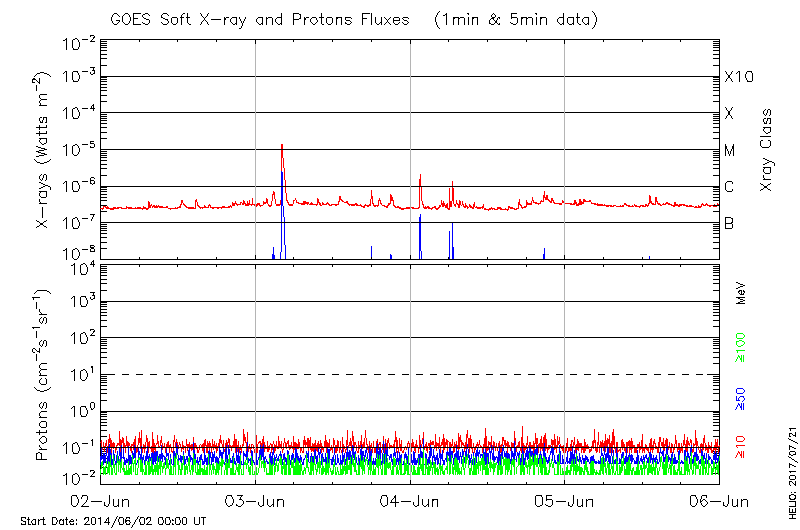 This page provides light-curves generated from GOES soft X-ray and Particle data for the date indicated at the top and the preceding three days.