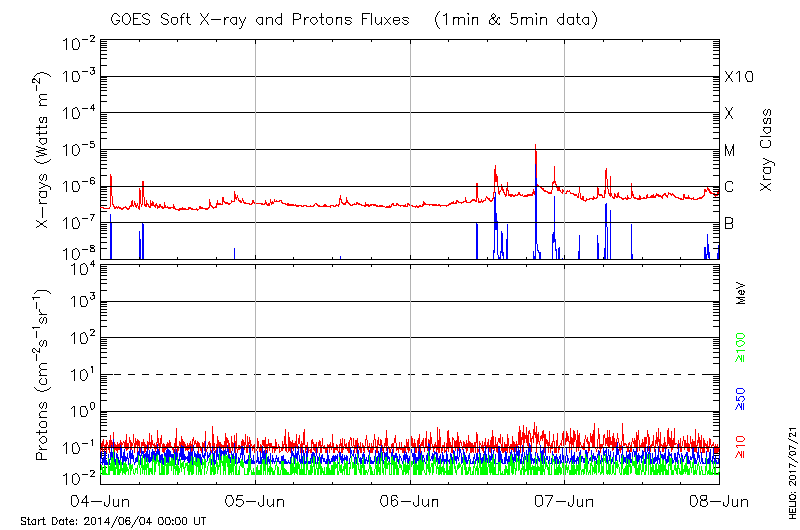 This page provides light-curves generated from GOES soft X-ray and Particle data for the date indicated at the top and the preceding three days.
