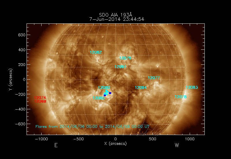 The locations of the flares over-plotted on the image are derived from the flare catalogue