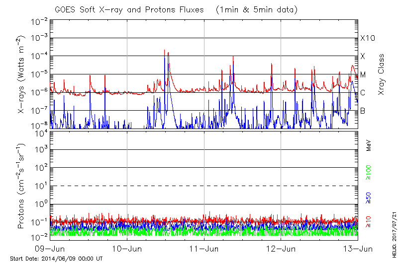 This page provides light-curves generated from GOES soft X-ray and Particle data for the date indicated at the top and the preceding three days.