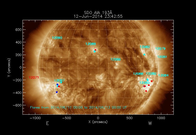 The most recent flares (≤12 hours) are shown as red dots, 12-24 hours ago as blue dots and older ones as turquoise dots.