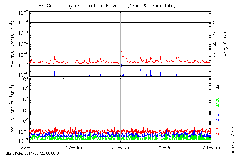 This page provides light-curves generated from GOES soft X-ray and Particle data for the date indicated at the top and the preceding three days.