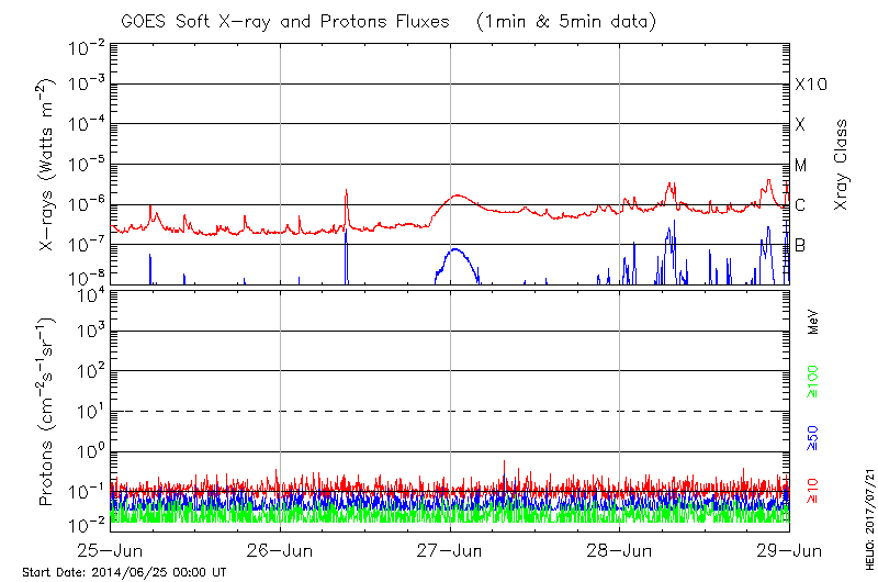 This page provides light-curves generated from GOES soft X-ray and Particle data for the date indicated at the top and the preceding three days.