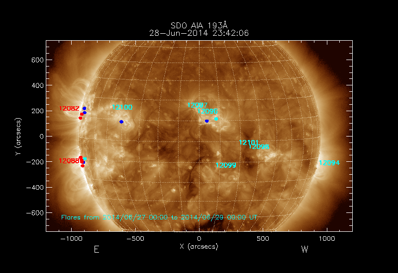 The locations of the flares over-plotted on the image are derived from the flare catalogue
