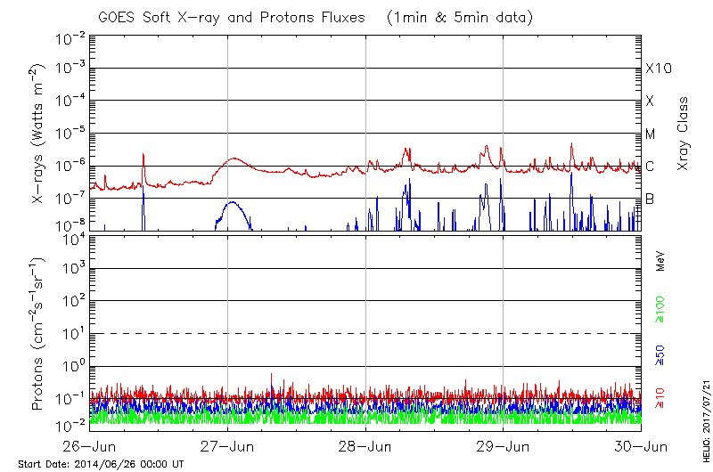 This page provides light-curves generated from GOES soft X-ray and Particle data for the date indicated at the top and the preceding three days.