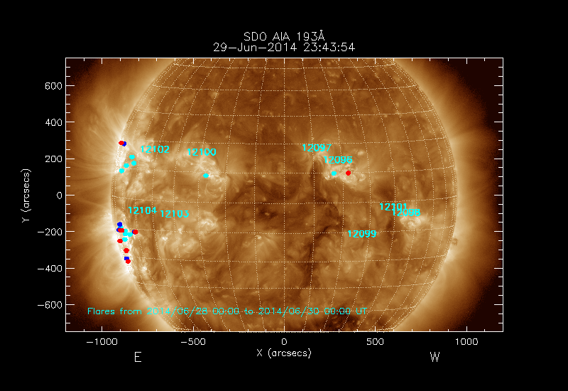 The locations of the flares over-plotted on the image are derived from the flare catalogue