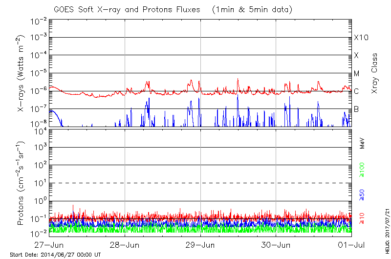 This page provides light-curves generated from GOES soft X-ray and Particle data for the date indicated at the top and the preceding three days.