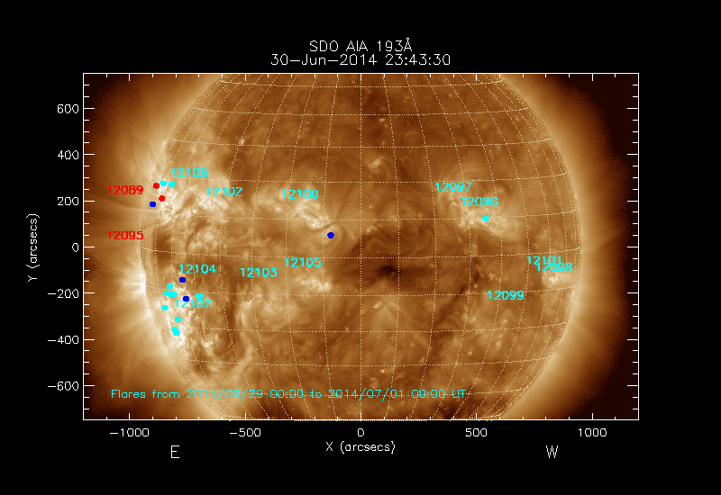 The locations of the flares over-plotted on the image are derived from the flare catalogue