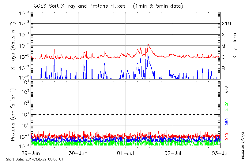 This page provides light-curves generated from GOES soft X-ray and Particle data for the date indicated at the top and the preceding three days.