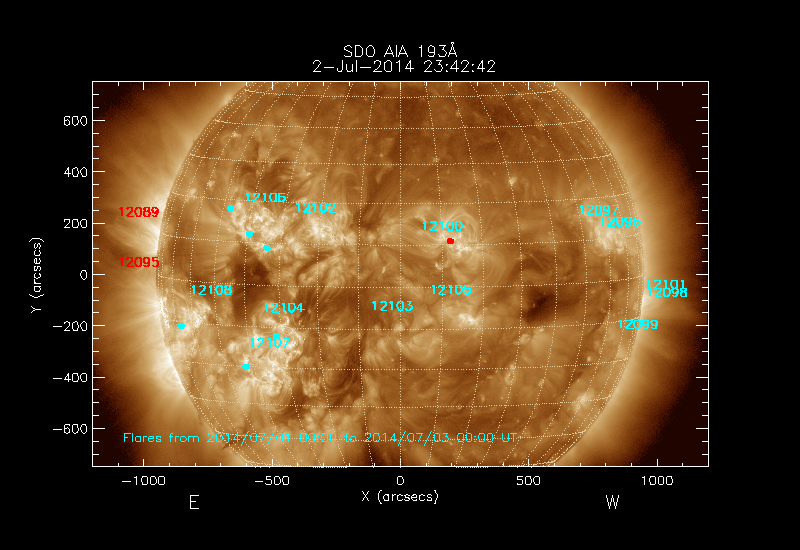 The locations of the flares over-plotted on the image are derived from the flare catalogue