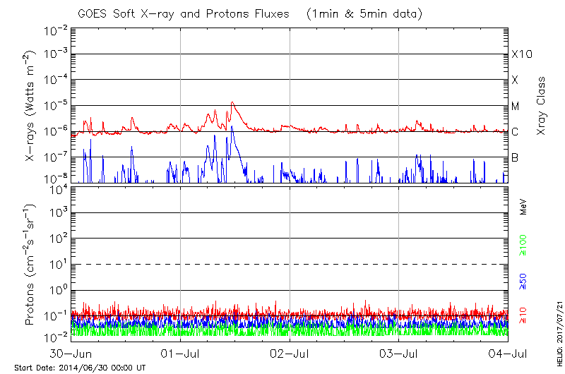This page provides light-curves generated from GOES soft X-ray and Particle data for the date indicated at the top and the preceding three days.