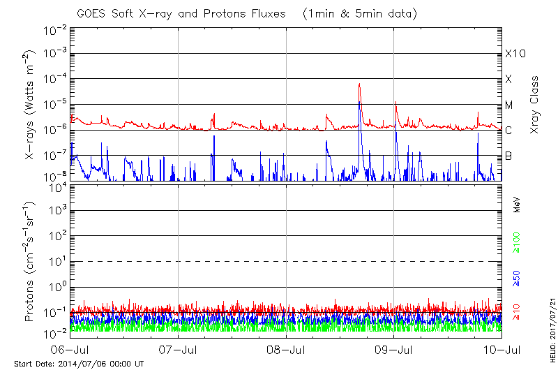 This page provides light-curves generated from GOES soft X-ray and Particle data for the date indicated at the top and the preceding three days.