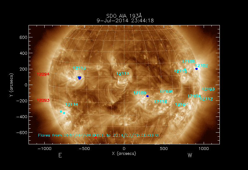 All soft X-ray flares (≥A1.0) where the location has been determined are shown; the flare locations are rotated to the time of the image