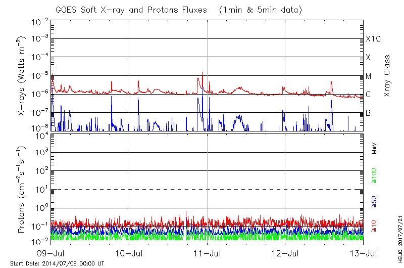 This page provides light-curves generated from GOES soft X-ray and Particle data for the date indicated at the top and the preceding three days.