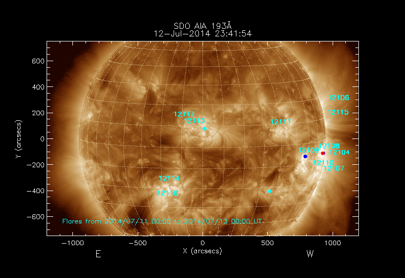 All soft X-ray flares (≥A1.0) where the location has been determined are shown; the flare locations are rotated to the time of the image