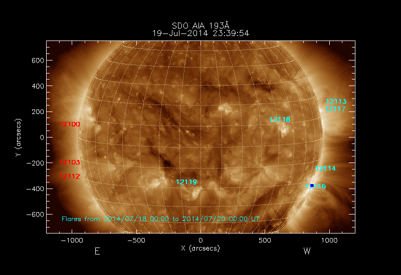 Click on an Active Region plot to display the Region Report including the region evolution and flaring history. HEC Search for NOAA Active Regions (SRS) records for this date and the day before.