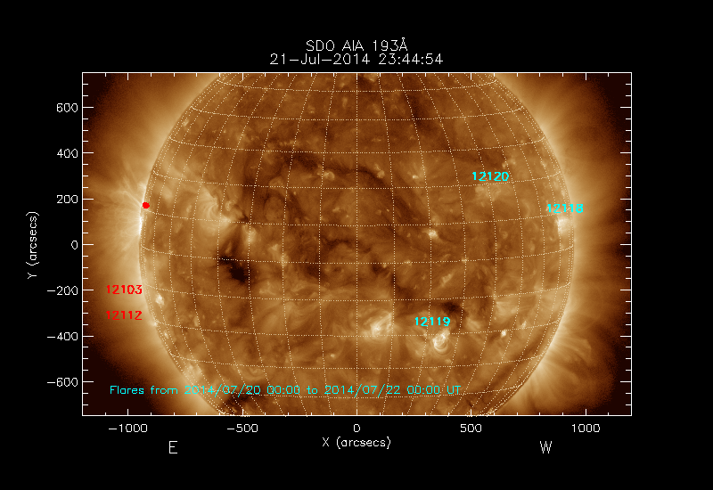 dots and 24-48 hours as turquoise dots; the flare locations are rotated to the time of the image.