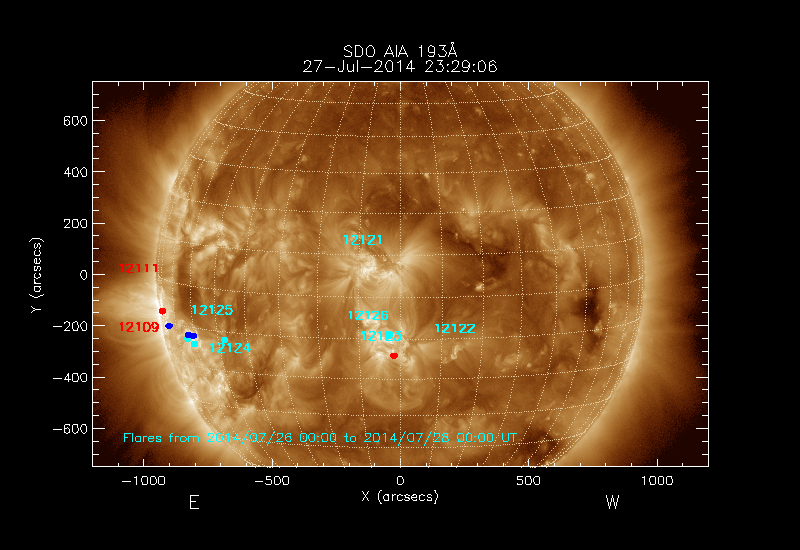 All soft X-ray flares (≥A1.0) where the location has been determined are shown; the flare locations are rotated to the time of the image