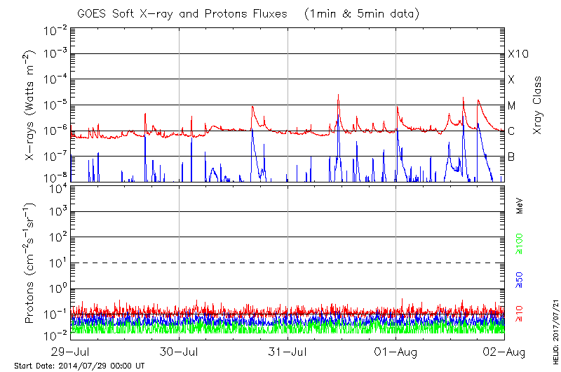This page provides light-curves generated from GOES soft X-ray and Particle data for the date indicated at the top and the preceding three days.