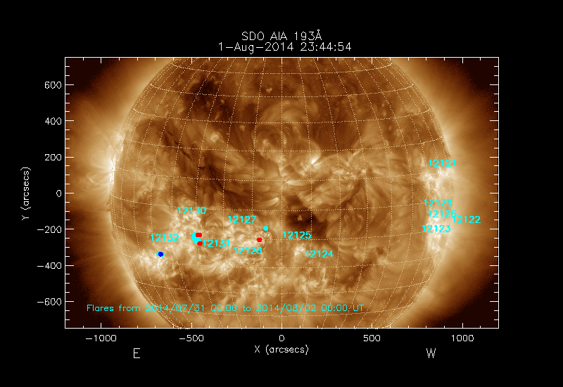 All soft X-ray flares (≥A1.0) where the location has been determined are shown; the flare locations are rotated to the time of the image