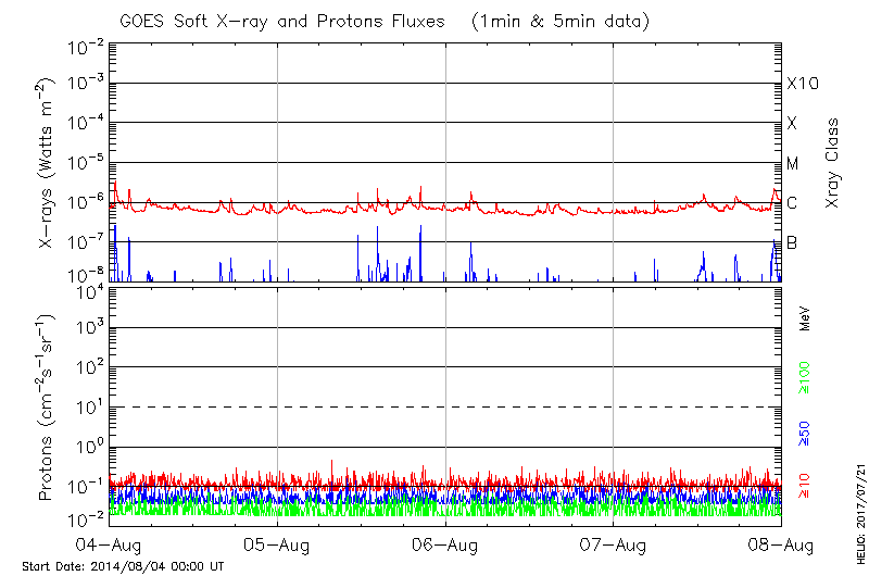This page provides light-curves generated from GOES soft X-ray and Particle data for the date indicated at the top and the preceding three days.
