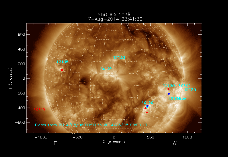 All soft X-ray flares (≥A1.0) where the location has been determined are shown; the flare locations are rotated to the time of the image