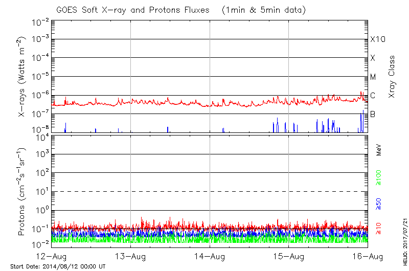 This page provides light-curves generated from GOES soft X-ray and Particle data for the date indicated at the top and the preceding three days.
