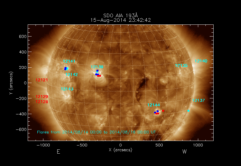 The most recent flares (≤12 hours) are shown as red dots, 12-24 hours ago as blue dots and older ones as turquoise dots.