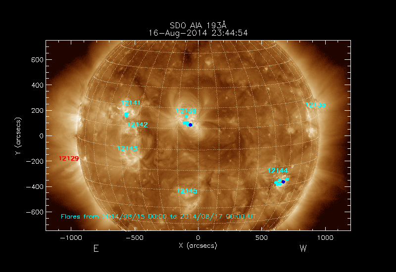 All soft X-ray flares (≥A1.0) where the location has been determined are shown; the flare locations are rotated to the time of the image