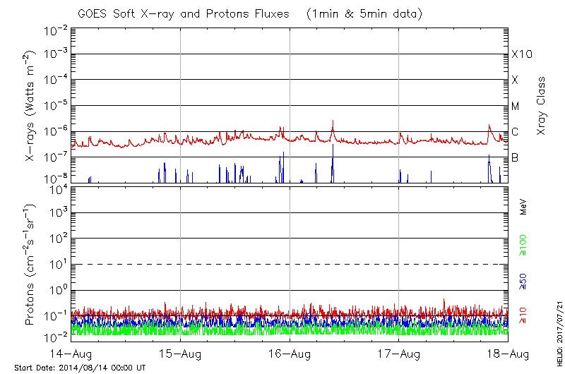 This page provides light-curves generated from GOES soft X-ray and Particle data for the date indicated at the top and the preceding three days.