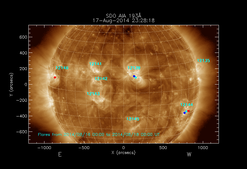 The most recent flares (≤12 hours) are shown as red dots, 12-24 hours ago as blue dots and older ones as turquoise dots.