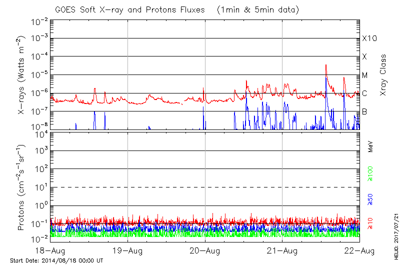 This page provides light-curves generated from GOES soft X-ray and Particle data for the date indicated at the top and the preceding three days.