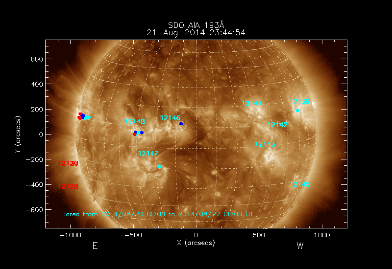 The most recent flares (≤12 hours) are shown as red dots, 12-24 hours ago as blue dots and older ones as turquoise dots.