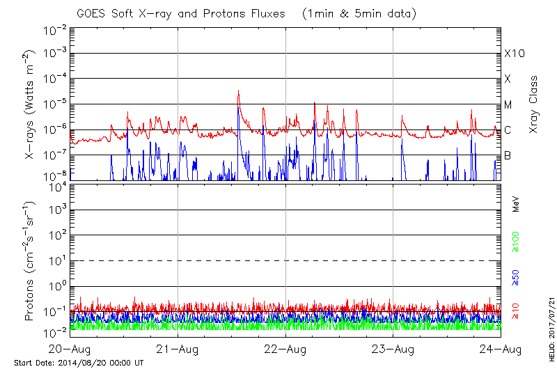 This page provides light-curves generated from GOES soft X-ray and Particle data for the date indicated at the top and the preceding three days.