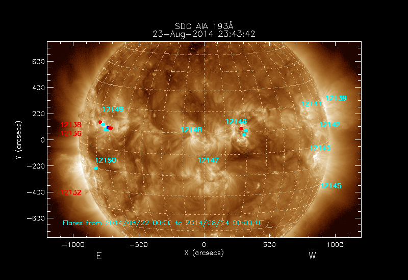 All soft X-ray flares (≥A1.0) where the location has been determined are shown; the flare locations are rotated to the time of the image