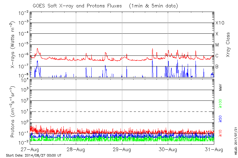 This page provides light-curves generated from GOES soft X-ray and Particle data for the date indicated at the top and the preceding three days.
