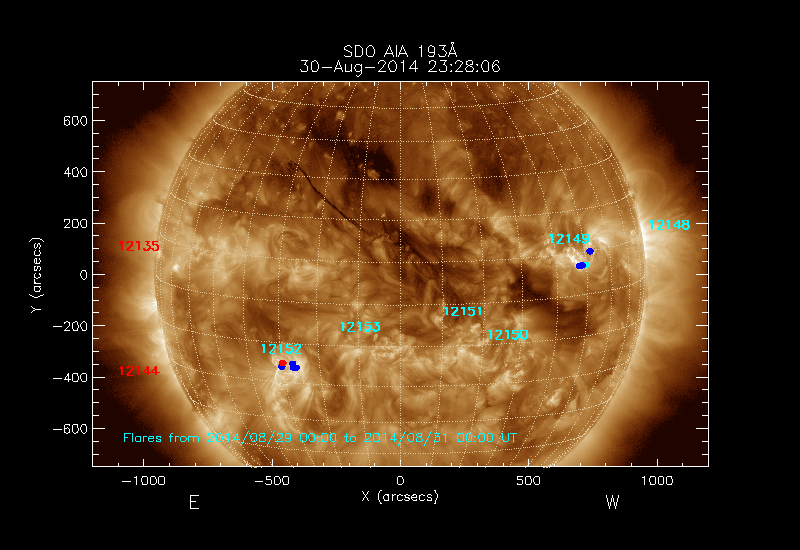Click on an Active Region plot to display the Region Report including the region evolution and flaring history. HEC Search for NOAA Active Regions (SRS) records for this date and the day before.
