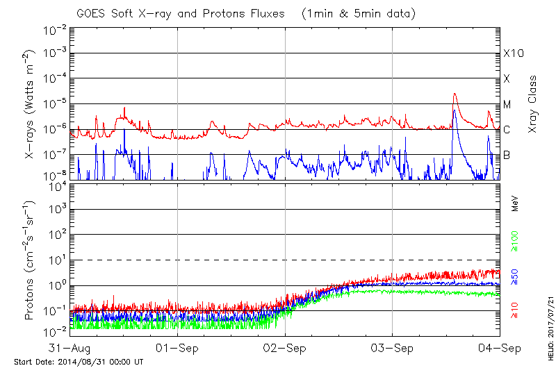 This page provides light-curves generated from GOES soft X-ray and Particle data for the date indicated at the top and the preceding three days.