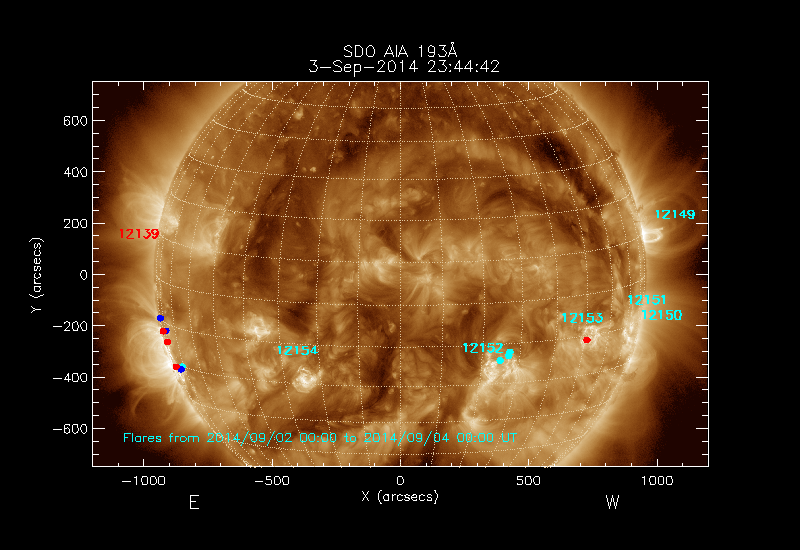 dots and 24-48 hours as turquoise dots; the flare locations are rotated to the time of the image.