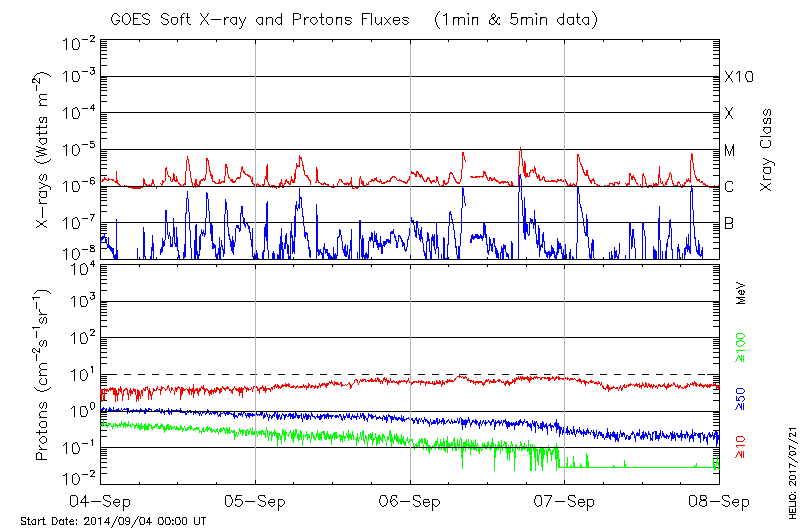 This page provides light-curves generated from GOES soft X-ray and Particle data for the date indicated at the top and the preceding three days.