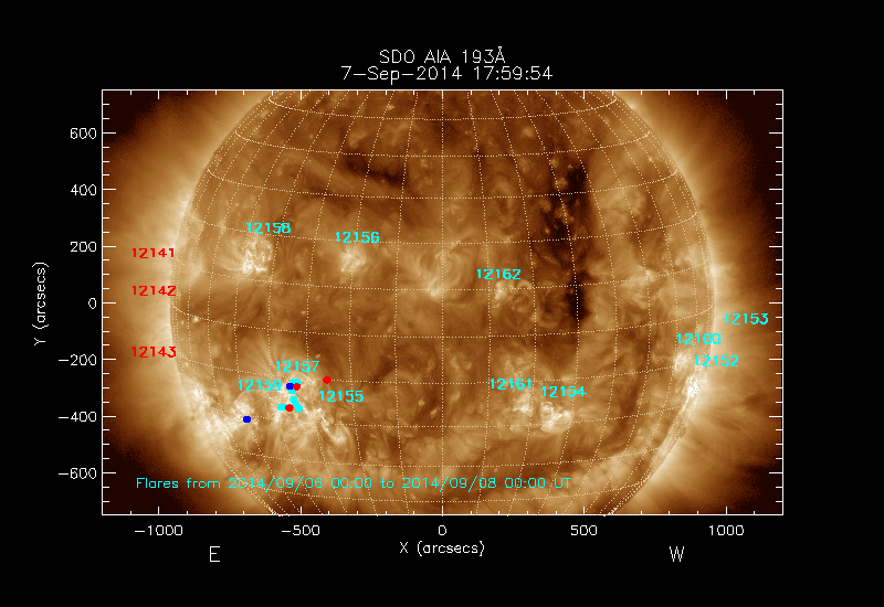 The most recent flares (≤12 hours) are shown as red dots, 12-24 hours ago as blue dots and older ones as turquoise dots.