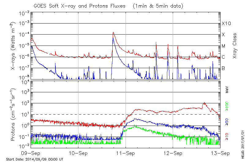 This page provides light-curves generated from GOES soft X-ray and Particle data for the date indicated at the top and the preceding three days.