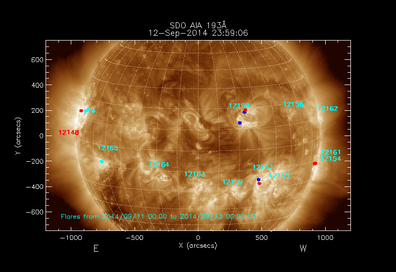 The most recent flares (≤12 hours) are shown as red dots, 12-24 hours ago as blue dots and older ones as turquoise dots.