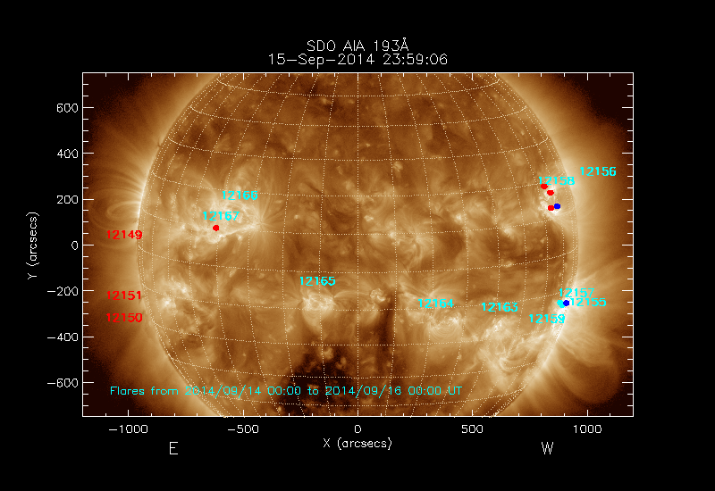 All soft X-ray flares (≥A1.0) where the location has been determined are shown; the flare locations are rotated to the time of the image
