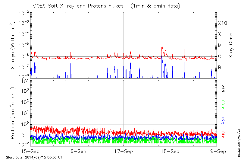 This page provides light-curves generated from GOES soft X-ray and Particle data for the date indicated at the top and the preceding three days.