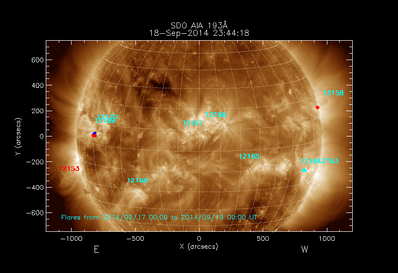 All soft X-ray flares (≥A1.0) where the location has been determined are shown; the flare locations are rotated to the time of the image